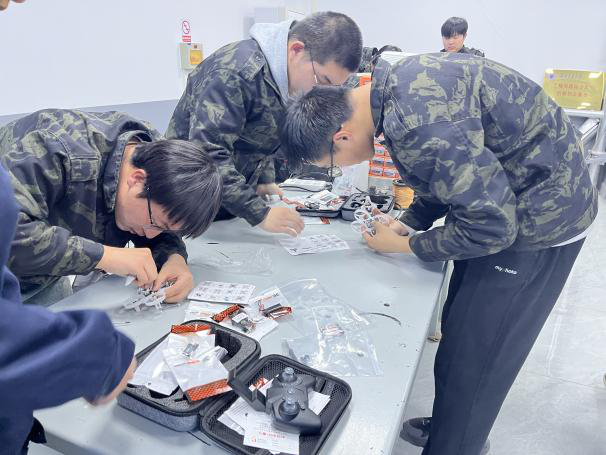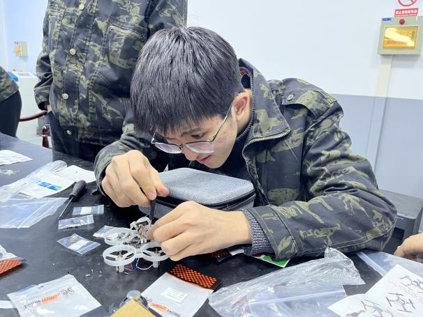 在实操训练阶段,学生们分组进行,从安装电动机、组装脚架,再到线路布置、连接并固定部件与PCB主板,每一步都严格按照工艺流程进行。在老师的指导下,学生们不仅掌握了无人机飞行、组装等基本技能,还学会了如何检查电路连接、调试飞行控制器等关键骤。