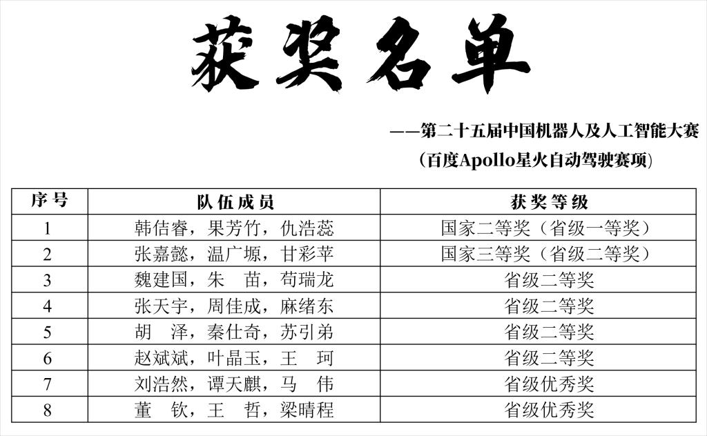 近日,第二十五届中国机器人及人工智能大赛在四川绵阳举行,比赛共吸引哈尔滨工业大学、东南大学、北京理工大学等全国120余所高等院校的近300支队伍参加。在学校创新创业学院的指导和支持下,中心主任武振锋、丁强军等教师指导的学生团队参加了百度Apollo星火自动驾驶赛项的角逐,并取得优异成绩,获得国家二等奖1项,三等奖1项。