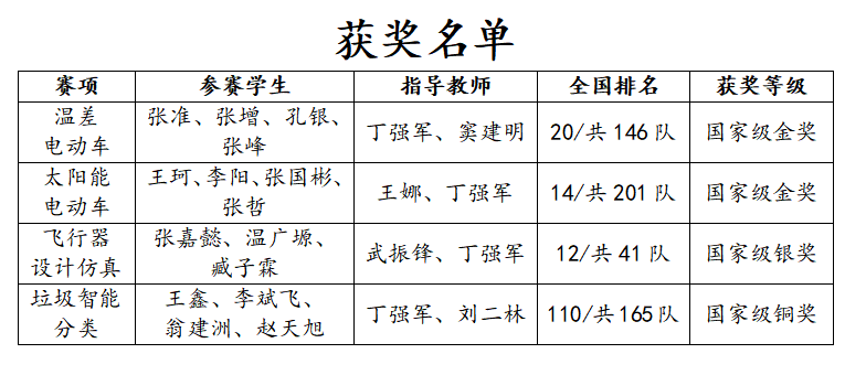 近期,由教育部高等学校工程训练教学指导委员会主办的2023年“第八届中国大学生工程实践与创新能力大赛”在全国多所高校举行,本届大赛在创新创业学院的大力支持下,机电工程学院有四个项目进入全国总决赛。经过激烈角逐,我院参赛的4个项目获得了太阳能电动车赛项金奖1项,温差电动车赛项金奖1项,飞行器设计仿真赛项银奖1项,垃圾智能分类赛项铜奖1项,这是我省高校首次在此项赛事中获得国家级金奖,创历史最佳战绩。